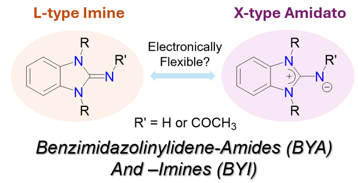 Electronically flexible ligands are an emerging class of ligands that possess the unique ability to adapt their donor strength based on the electronic demands of their coordinating environment. Here, the preparation of benzimidazolinylidene-imines (BYIs) and -amides (BYAs) as well as their first palladium(II) complexes are described. The latter could represent a new class of electronically flexible ligands. The electronic properties of these BYI and BYA ligands were evaluated using the Huynh electronic parameter (HEP). The preliminary catalytic application of bis(BYI) and bis(BYA) palladium(II) complexes in the direct C–H arylation of heteroarenes was also explored.
