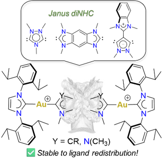 A series of Janus-type hetero-tetrakis(NHC) dinuclear gold(I) complexes of the general formula [AuI2(NHC)2(μ-Janus diNHC)]X2 {NHC = 1,3-diisopropyl-benzimidazolin-2-ylidene (iPr2-bimy) or 1,3-bis(2,6-diisopropylphenyl)-imidazolin-3-ylidene (IPr); X = BF4, PF6, OTf} were synthesized. These complexes contain 1,2,4-triazolidin-3,5-diylidene (ditz), benzobis(imidazolin-2-ylidene) (BBI) and the mesoionic pyrazolidin-3,5-diylidene (dipy) as distinct Janus-type diNHCs. Some of the complexes were susceptible to ligand redistribution, which was fastest for the mesoionic dipy digold(I) complex. Introduction of the bulky IPr ligand could significantly slow down this process. The respective gold(III) counterparts [AuIII2Br4(NHC)2(μ-Janus diNHC)]X2 were obtained by oxidation of the homonuclear gold(I) complexes with elemental bromine further increasing stability. Comparison of the IPr carbene resonances in the dinuclear gold complexes show an increasing trend for the Janus diNHC system 1,2,4-triazolidin-3,5-diylidene (ditz) < benzobis(imidazolin-2-ylidene) (BBI) < mesoionic pyrazolidin-3,5-diylidene (dipy), which is in line with their increasing donicities.