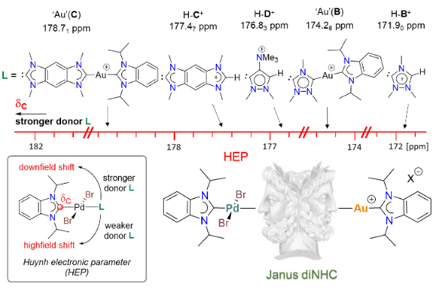 Huynh’s electronic parameter (HEP) was applied to distinguish the electronic properties of benzimidazole and pyrazole donors in N^N ditopic and N^N‘ hetero-ditopic, dinucleating ligands by 13C NMR spectroscopy of their dipalladium complexes bearing terminal iPr2–bimy reporter ligands. The 13Ccarbene NMR resonances of the iPr2-bimy ligand (HEPs) indicate stronger donation of the symmetrical dibenzimidazole compared to that of the dipyrazole with a DHEP value of 1.54 ppm. Based on this benchmark value, the effect of spacer groups on the electron donation of the mixed benzimidazole-pyrazole ligands was investigated for the first time. The donicity gap between the benzimidazole and pyrazole donors increases with alkylene spacers, but shrinks with the 1,4-phenylene linker, suggesting electronic communication between the two different heterocycles via p-electron conjugation. Furthermore, these complex probes could also be used to catalyze the direct arylation of pentafluorobenzene, which showed that the unsymmetrically bridged, dinuclear complexes with alkylene linkers are more reactive.